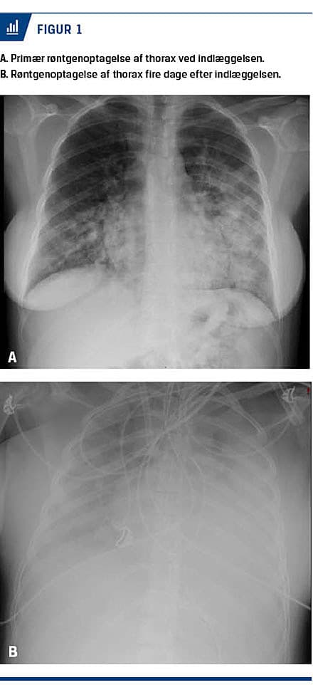 På mistanke om præterm fødsel blev der givet lungemodnende behandling med et højpotent steroid, betamethason, 12 mg × 2. Desuden blev hun behandlet med pivmecillinam på mistanke om cystitis acuta. En urindyrkning viste vækst af Escherichia coli med resistens for pivmecillinam, hvorfor behandlingen blev ændret til cefuroxim. Efter to døgns indlæggelse forværredes hendes respirationsbesvær. En røntgenoptagelse af thorax viste bilaterale infiltrative forandringer (Figur 1A). I tillæg hertil fandt man stigende infektionstal