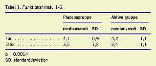 Med hensyn til de primære undersøgelses endepunkter var der en tendens, men ikke statistisk signifikant, til en reduktion af hyppigheden af svimmelhedsanfaldene (p=0,090). Patienternes funktionsniveau forbedres statistisk signifikant i den aktive gruppe sammenlignet med i placebogruppen (p=0,0014), Tabel 1, og det samme var tilfældet i visuel analogskala (VAS)-evalueringen af svimmelhed (p=0,005), Tabel 2.
