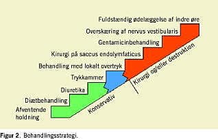 Meniett-apparatet inducerer en højsignifikant bedring af svimmelhedssymptomer hos patienter med Menières sygdom. Behandlingen er uskadelig og involverer ikke kirurgisk intervention ud over anbringelse af ventilationsdræn i trommehinden. Den bør derfor tilbydes patienten, inden man går videre i rækken af interventioner som indebærer kirurgi (Figur 2).