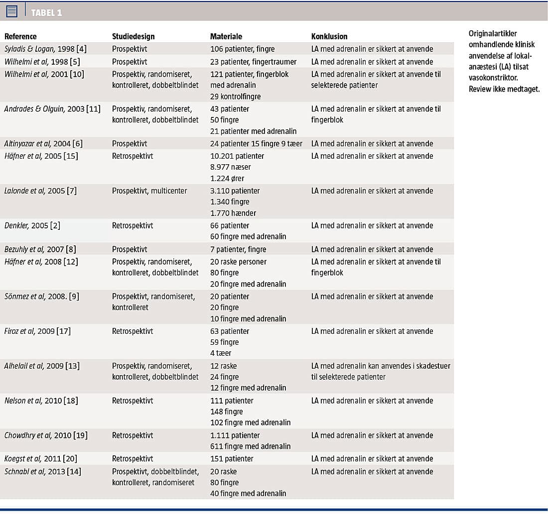Ved søgning på PubMed og gennemgang af de inkluderede artiklers referencelister fandtes fem prospektive observationsstudier [4-8], et prospektivt, randomiseret og kontrolleret studie [9], fem prospektive, randomiserede, kontrollerede og dobbeltblindede studier [10-14], seks retrospektive opgørelser [15-20], syv review [2, 3, 21-25], fire kommentarer og et dyrestudie. I alt indgik der 15.238 patienter, hvoraf 14.651 havde fået injiceret LA med adrenalin. Originalstudierne er listet