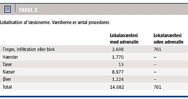 I de ovennævnte artikler har man undersøgt adrenalinkoncentrationer fra 1:80.000 til 1:1.000.000, hyppigst 1:100.000-200.000 (2.542 fingre og hænder, 13 tæer, 8.977 næser og 1.224 ører) [5-8, 10-13, 15-20]. For fem patienter var adrenalinkoncentrationen ikke oplyst [16]. I Danmark anvendes der typisk en adrenalinkoncentration på 1:200.000, helt i overensstemmelse med ovenstående (f.eks. lidocain med adrenalin 10 mg/5 mikrogram).
