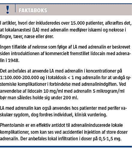vaskulære system i fingre, tæer, ører og næse er risikabelt og kan medføre iskæmi og nekrose. Mange klinikere har dog erfaret, at LA tilsat vasokonstriktor kan anvendes sikkert og med store fordele, ligesom man i de seneste 15 års litteratur på området, hvori der indgik ca. 15.000 patienter, har slået fast, at anvendelse