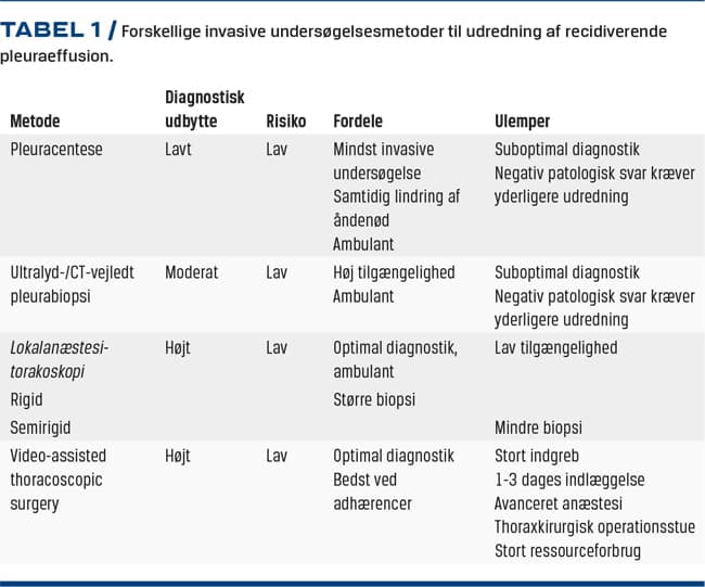 Pleuraeffusion kan være et symptom på alvorlig sygdom og bør derfor udredes. Udredningen er ofte afhængig af pleurabiopsi. LAT er en sikker, skånsom, ambulant biopsimåde, der giver meget højt diagnostisk udbytte og er omkostningsbesparende i forhold til den i Danmark hyppigst anvendte torakoskopimetode, VATS. LAT bør være næste del af udredningen af recidiverende pleuraeffusion, hvis cytologisk undersøgelse af pleuravæske ikke har givet diagnostisk resultat.