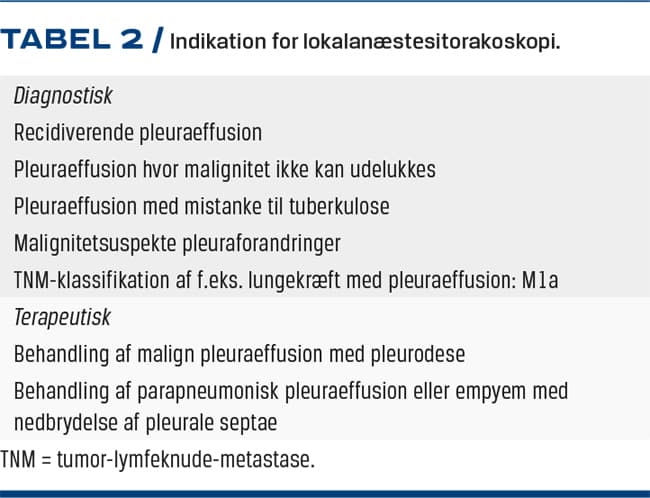 Terminologien for torakoskopisk pleurabiopsi giver ofte anledning til forvirring. »Medicinsk torakoskopi« er en udbredt betegnelse, selv om der ikke er noget særligt medicinsk over proceduren. En ældre benævnelse er »pleuroskopi«, der korrekt beskriver, at man inspicerer pleura, men ikke beskriver metoden til det. Vi har valgt at bruge det internationale begreb LAT, som beskriver, at proceduren er en endoskopi af thorax, og at den foretages med lokalbedøvelse og altså hos vågne, sederede patienter, der ikke har behov for endotrakeal intubation. Herved adskiller LAT sig fra VATS, der ressourcemæssigt (tid, personale, apparatur, indlæggelse, operationsstue og opvågning) er betydeligt mere omkostningstung [18] (Tabel 1). I et dansk, retrospektivt studie fra 2014 så vi, at på afdelinger med tilgang til LAT reduceredes behovet for VATS-torakoskopi med 88% [19].