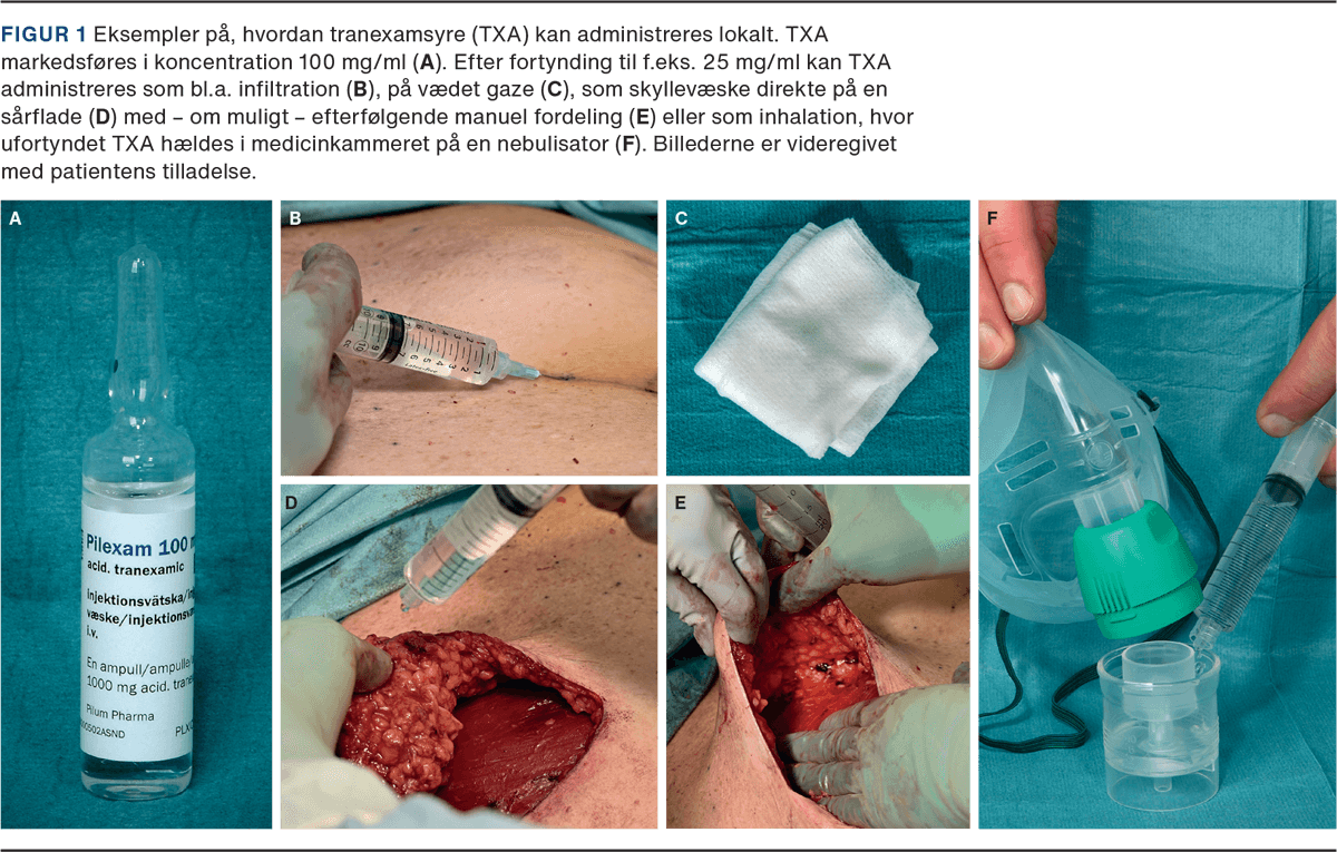 TXA kan derudover administreres lokalt enten topisk, infiltreret eller inhaleret. Vi ønsker med denne artikel at beskrive de hidtil undersøgte lokalanvendelsesområder for TXA. Andre produkter og medikamenter, som ligeledes kan lokalanvendes med henblik på hæmostase, diskuteres ikke i indeværende artikel.