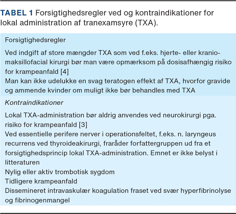 Forsigtighedsregler ved og kontraindikationer for lokal TXA-administration angives i Tabel 1.