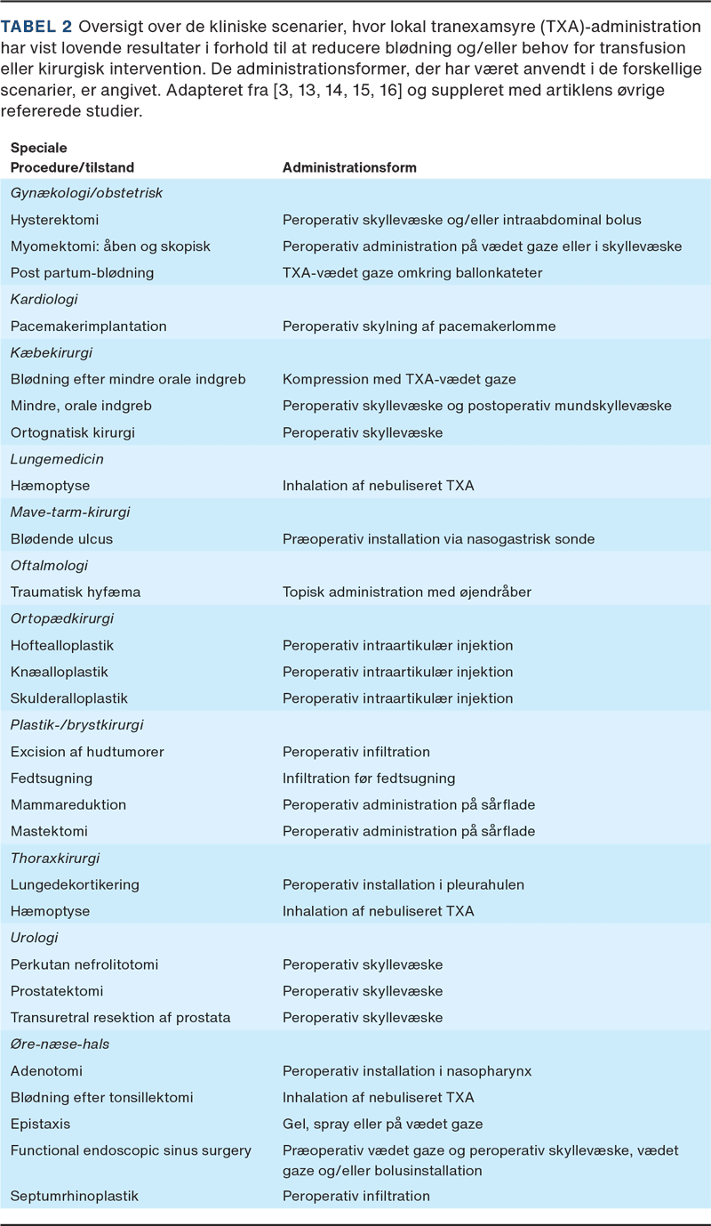 På grund af bekymring for bivirkninger ved systemisk administration har lokal TXA-administration været undersøgt med lovende resultater i en række forskellige specialer og indgreb (Tabel 2).