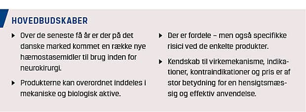 Hæmostase er af fundamental betydning i hjerne- og rygkirurgien. Insufficient blødningskontrol er, pga. det neuronale vævs sårbarhed for tryk og iskæmi, associeret med betydelig morbiditet og mortalitet. Parallelt hermed medfører vævets vulnerabilitet begrænsninger i brug af klassiske kirurgiske hæmostaseteknikker som kompression, karligering og diatermi.