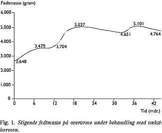 GH-behandlingen forbedrede initialt kropssammensætningen. Dual-energy X-ray absorptiometry (DEXA)-scanning viste et tab i total fedtmasse (-2.800 g), øget total muskelmasse (+1.650 g) og en stigning i knoglemineralindhold (BMC) og knoglemineraltæthed (BMD) som udtryk for klinisk effekt efter et års behandling. Fem år efter behandlingsstart sås imidlertid regres af kropssammensætningen til udgangsværdierne. Patientens vægt var 62,8 kg før behandling, og henholdsvis 61,7 kg, 62,5 kg og 62,8 kg efter et, tre og fem års behandling. Efter behandlingsstart udviklede patienten tiltagende fedtophobning på overarmene (OE). En UL-scanning viste hyperplasi af det subkutane fedtvæv, som målte 2 cm. En DEXA-scanning viste stigende fedtmasse på OE - på tre år var fedtmassen på OE steget med 93% af udgangsværdien (Fig. 1). I november 1999 og i maj 2000 fik patienten ved fedtsugning fjernet 2.400 ml fedtvæv fra OE og 400 ml fra nakken/ryggen.
