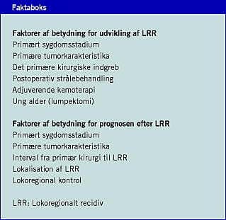 Endvidere er der definitoriske forskelle, idet man i nogle studier har medtaget alle LRR, mens man i andre kun har inkluderet patienter med isolerede LRR. Risikoen for LRR forøges med stigende T- og N-stadium, ved ikkeradikal kirurgi og ved inkomplet aksilrømning. Hos udvalgte højrisikopatienter medfører postoperativ strålebehandling, at risikoen for LRR reduceres med ca. to tredjedele [3]. Adjuverende kemoterapi, der indeholder anthracykliner, reducerer risikoen for LRR med ca. 10% [4].