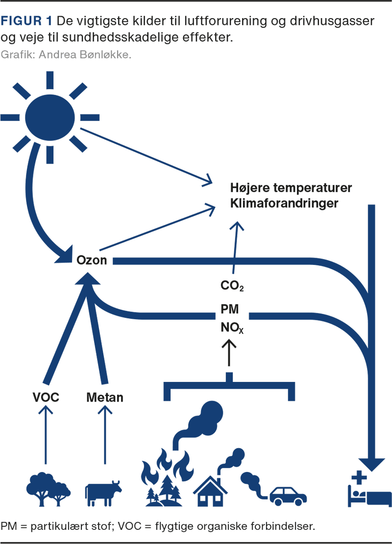 Ofte stammer luftforurening fra de samme kilder, som udleder gasser og partikler med drivhuseffekter på klimaet. Ozon og PM2,5 stammer primært fra langtransport, i Danmark især fra Sydvesteuropa. Sekundært dannet PM2,5 fra landbrug og brændeovne i Danmark bidrager ligeledes til dette. NO2 har især lokale kilder, f.eks. fra køretøjer med brændstofmotorer, som også udleder CO2. Den kendteste drivhusgas, CO2, kan have negative helbredseffekter, men for CO2 observeres effekter som nedsat koncentrations- og arbejdsevne først ved højere niveauer end de atmosfæriske værdier, f.eks. i bygninger med stor personbelastning [6]. Ozon i udeluften medfører derimod såvel sundhedsskadelige risici som drivhuseffekter i atmosfæren, hvor gassen dannes ud fra både naturligt forekommende flygtige forbindelser og fra menneskeskabt forurening (Figur 1).