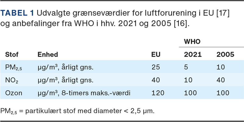 Den nyere viden om, at der ikke kan findes nogen tærskelværdi for luftforureningens effekter, som kan observeres ved selv de laveste koncentrationer, har været en del af grundlaget for, at WHO har reduceret anbefalede maksimalkoncentrationer for PM2,5 og NO2 betydeligt i deres retningslinjer for luftkvalitet i 2021 [16]. Disse er langt under de gældende i EU [17] (Tabel 1).