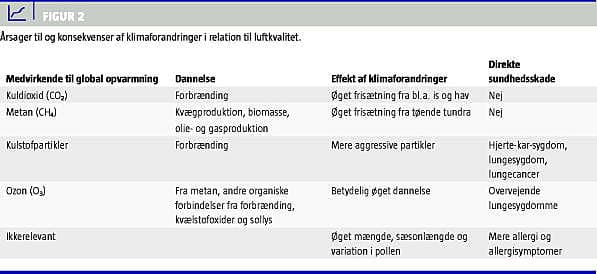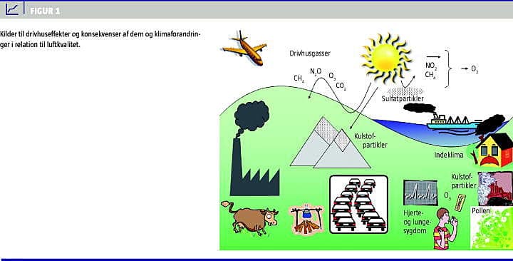 Udledningen af drivhusgasser fra menneskelige aktiviteter forventes at hæve gennemsnitstemperaturen og at øge forekomsten af ekstreme vejrforhold. Disse meteorologiske ændringer vil have potentielt alvorlige konsekvenser for menneskers sundhed, direkte såvel som indirekte [1]. Denne oversigtsartikel fokuserer på danske forhold vedrørende temperatur og luftkvalitet.