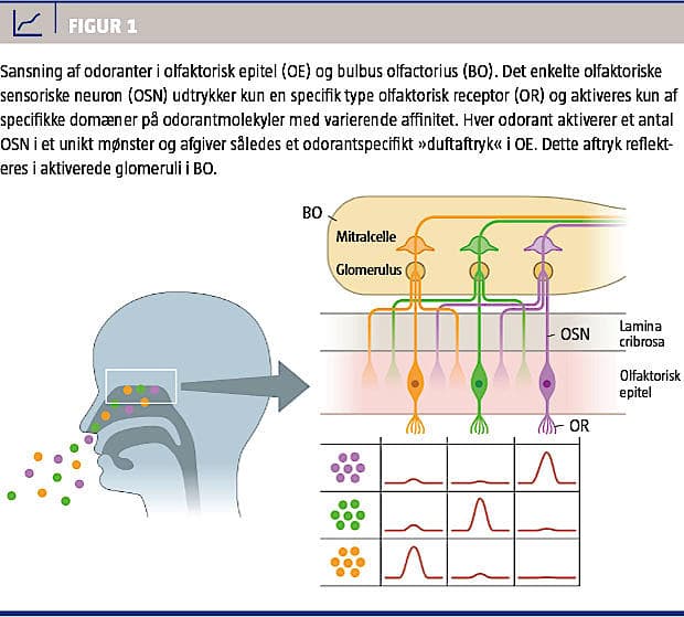 Når odoranterne cirkulerer til regio olfactorica, skal de passere et vandholdigt mukøst lag, før de kan interagere med OR på OSN. Odoranternes passage gennem mucuslaget afhænger af deres fysiske og kemiske egenskaber og faciliteres af transportproteiner, som sikrer transport af de hydrofobe odoranter til OSN og muligvis indgår i diskriminationsprocessen [13]. I det menneskelige genom findes der omkring 900 gener og pseudogener, hvor hvert gen koder for en specifik OR. På det enkelte OSN er der kun repræsenteret én OR-type [14], som binder unikke molekylære domæner på odorantmolekylerne med forskellig affinitet. Impulser fra neuroner med samme OR-ekspression konvergerer mod BO og danner synapse i specifikke glomeruli. Således afgiver den enkelte odorant et specifikt »duftaftryk« i OE, baseret på kvalitativ og kvantitativ OR-aktivering. »Duftaftrykket« reflekteres i aktiverede glomeruli i BO, hvor der endvidere foregår en kompleks neuromodulering, før impulserne forløber centralt via mitralceller.