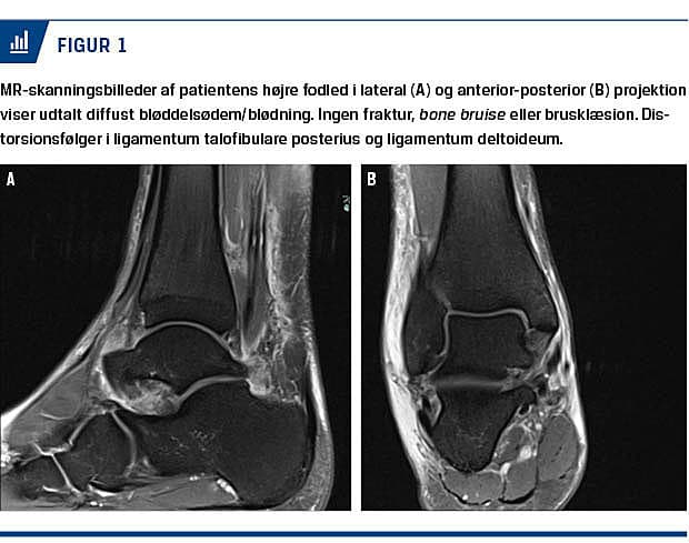 Efter tre dage blev han indkaldt til MR-skanning (Figur 1). Skanningsbillederne blev vurderet af en radiologisk overlæge, som beskrev udtalt, diffust bløddelsødem/blødning omkring fodleddet, især lateralt, diffus signaløgning af ligamentum talofibulare posterius og distorsionsfølger i ligamentum deltoideum. Ingen fraktur, bone bruise, brusklæsion, ledansamling eller senelæsion.