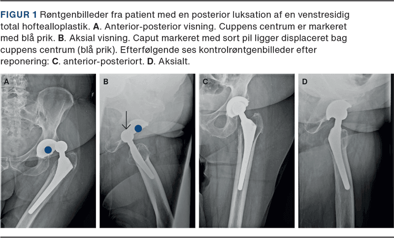 THA-luksation defineres som komplet displacering af metalhovedet, dvs. caput, fra acetabularkomponenten, dvs. cuppen. Den typiske luksation opstår i forbindelse med hurtige bevægelser med en for kraftig fleksion i hoften, evt. kombineret med indadrotation. Det resulterer i en posterior luksation (Figur 1), hvorimod strækning af hoften og samtidig udadrotation kan føre til anterior luksation. Klassiske mekanismer herfor omfatter mobilisering fra en lav stol eller seng, fremadbøjning for at tage strømper på eller binde sko eller ved et faldtraume [10]. Luksationen medfører øjeblikkelig intens smerte og manglende evne til mobilisering. Klinisk set er man sjældent i tvivl om diagnosen, og der er fejlstilling og forkortning af benet (flekteret, indadroteret hofte ved posterior luksation; ekstenderet, udadroteret hofte ved anterior luksation). Røntgenundersøgelse er nødvendig for at bekræfte diagnosen og for at udelukke periprostetisk fraktur. Langt størstedelen af luksationerne kan behandles med lukket reponering under enten sedation eller en kort general anæstesi. Akut åben kirurgi er sjældent nødvendig [11].