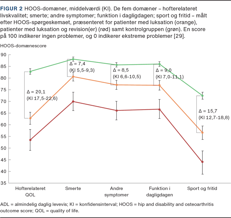 En hofteluksation sætter sig dybt i patienten og fører til frygt for nye luksationer. Trods komplikationens hyppighed er patienternes oplevelse ikke et område, der tidligere har været meget fokus på [28]. I et nyere kohortestudie viste man, at den helbredsrelaterede livskvalitet og subjektive hoftefunktion var signifikant lavere hos patienter med tidligere luksation, og især bemærkelsesværdigt var den hofterelaterede livskvalitet vedvarende lavere selv op til fem år efter den seneste luksation (Figur 2). Patienter med kun en enkelt luksation opnåede desuden aldrig samme hofterelaterede livskvalitet som kontrolgruppen, hvilket indikerer, at nogle patienter måske aldrig kommer sig helt over oplevelsen [29].