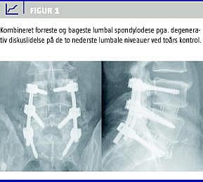 Det operative indgreb varierer mellem et simpelt bageste indgreb og et kombineret forreste og bageste indgreb på flere niveauer med frilægning af de neurale strukturer. Afhængig af den primære lidelse er der varierende evidens for valg af behandling. Ved degenerativt betinget spondylolistese og spinalstenose er der nogen effekt af spondylodese over for nonoperativ behandling [5-7]. Andre og ældre studier fandt ikke nogen klinisk betydende forskel bortset fra øget ossøs heling ved instrumenteret over for uinstrumenteret spondylodese [8]. Ved isoleret degenerativ diskuslidelse uden påvirkning af de neurale strukturer har et studie [9-10] med få patienter i hver gruppe påvist, at kognitiv terapi er ligeværdig over for kirurgisk behandling. Et andet studie med mange patienter i hver gruppe, men med forskellige diagnoser og forskellige operative procedurer, viste ingen forskel mellem kirurgisk behandling over for kombineret fysioterapi og kognitiv terapi [11]. Et dansk studie har vist, at kombineret forreste og bageste lumbal spondylodese (Figur 1 ) er bedre end bageste alene [12], mens et svensk studie ikke fandt forskel mellem de forskellige operative teknikker [4]. På grund af det varierende, men også med tiden noget bedre evidensgrundlag for lumbal spondylodese og den observerede stigende hyppighed af operativ aktivitet har der været en intensiv diskussion om indikationsgrundlaget og valget af operativ metode. Afhængig af diagnose går tendensen i retning af enten stigende eller faldende hyppighed af forreste spondylodese [4, 12].
