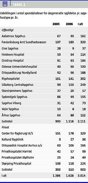 Resultater: Der blev foretaget henholdsvis 2.111 og 903 spondylodeser på 14 offentlige og seks private sygehuse i perioden 2005-2006. Operationsaktiviteten steg fra 993 til 1.118 indgreb på de offentlige og fra 393 til 510 indgreb på de private hospitaler, hvor sidstnævnte udførte 31,3% af alle indgreb i 2006. Der blev foretaget 196 isættelse af diskusproteser, 162 forreste spondylodeser, 2.309 bageste spondylodeser og 347 kombinerede forreste og bageste spondylodeser. Operationsindikationen var 245 spondyloser, 1.174 spinalstenoser, 947 diskusdegenerationer, 600 spondylolisteser og 45 for lumbago. Totalt blev bageste lumbal spondylodese anvendt hos 81,9% af patienterne på de private sygehuse og hos 74,3% af patienterne på de offentlige sygehuse.