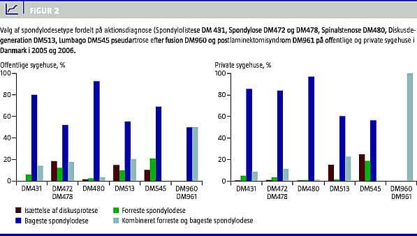 Valg af spondylodese baseret på aktionsdiagnose på offentlige og private sygehuse er vist i Figur 2 . På grundlag af aktionsdiagnosen spondylolistese blev der i offentligt regi foretaget 352 bageste indgreb og 62 kombinerede bageste plus forreste indgreb mod henholdsvis 136 og 14 i privat regi (χ2 : p = 0,11). På grundlag af aktionsdiagnosen spondylose blev der i offentligt regi foretaget 82 bageste indgreb og 28 kombinerede bageste plus forreste indgreb mod henholdsvis 73 og ti i privat regi (χ2 : p = 0,03). Baseret på aktionsdiagnosen spinalstenose blev der i offentligt regi foretaget 741 bageste indgreb og 28 kombinerede bageste plus forreste indgreb mod henholdsvis 360 og fem i privat regi (χ2 : p = 0,05). På grundlag af aktionsdiagnosen diskusdegeneration blev der i offentligt regi foretaget 102 isættelser af diskusprotese, 66 forreste indgreb, 373 bageste indgreb og 137 kombinerede bageste plus forreste indgreb mod henholdsvis 41, 5, 162 og 61 i privat regi (χ2 : p = 0,0006). Der var ingen forskel i valg af forreste eller kombineret forreste og bageste indgreb mellem offentlig og privat regi (p = 1,0). Diskusprotese blev i privat regi for en anvendt på indikationen spondylose, 41 på indikationen diskusdegeneration, to på spinalstenose og fire på lumbago og i offentligt regi henholdsvis 29, 102, 13 og tre (χ2 : p = 0,0017). Totalt anvendte de private sygehuse kombineret bageste plus forreste lumbal spondylodese hos 10,1% af patienterne, mens de offentlige anvendte kombineret bageste plus forreste lumbal spondylodese hos 12,1% af patienterne. Bageste lumbale spondylodese blev anvendt hos 74,3% i det offentlige regi og 81,9% i privat regi.