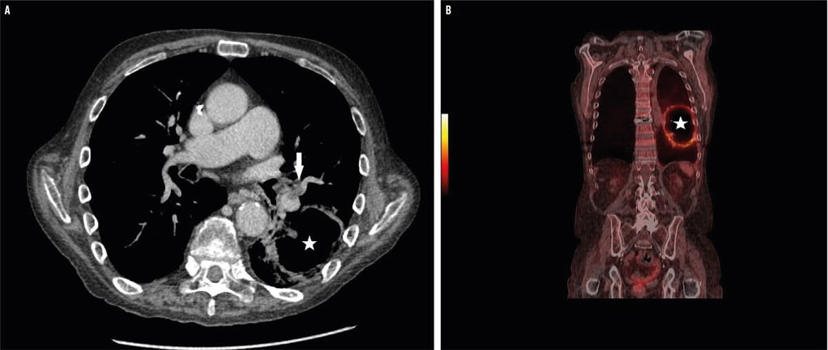 En 60-årig mand blev indlagt med forværring i åndenød gennem en måned, rygsmerter samt et vægttab på 10 kg. Ved indlæggelsen var niveauet af C-reaktivt protein 400 mg/l, og ved en røntgenoptagelse påviste man en 8 x 8 cm stor kavitet i venstre lunge. Dette gav mistanke om en tømt absces, hvilket blev bekræftet ved en CT, hvor man i tillæg påviste flere lungeembolier (LE) bilateralt (A, pilen viser LE, stjernen viser absces). Abscessen var ikke synlig på et røntgenbillede taget fire dage forinden. En supplerende PET/CT viste opladning af abscessens kapsel og afkræftede malignitet (B, stjernen viser absces). Bakteriel agens blev ikke identificeret, og patienten bedredes på behandling med bredspektret antibiotika i seks uger samt warfarin i seks måneder.