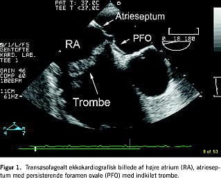 Efter perfusionsskintigrafi forstærkedes mistanken om lungeemboli, og ved transtorakal ekkokardiografi (TTE) verificeredes en trombe i højre atrium. Der var dilatation af højre ventrikel og et øget systolisk pulmonaltryk på 60 mmHg. Ved transøsofageal ekkokardiografi (TEE) fandtes tromben at være indkilet i et PFO (Figur 1 ), men uden at penetrere til venstre atrium. Der var ingen tromber i v. cava eller aa. pulmonales.