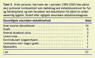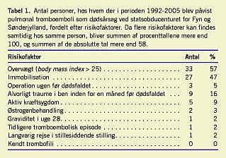 Materiale og metoder: I undersøgelsen indgik 58 afdøde personer, hos hvem der blev påvist en letal pulmonal tromboemboli ved obduktion foretaget af statsobducenturet for Fyn og Sønderjylland i 1992-2005. Data er indsamlet fra obduktionserklæringer, politirapporter og hospitalsjournaler. Undersøgelsen er en deskriptiv case-only- undersøgelse.