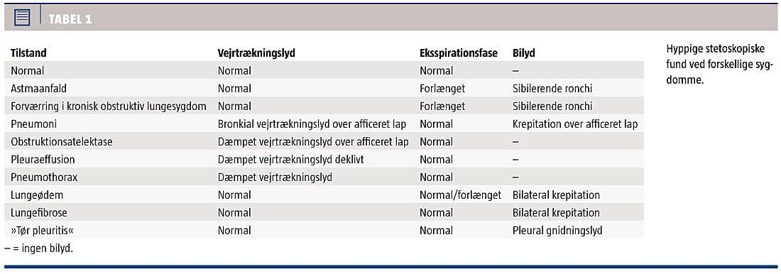 Siden Laennec for snart 200 år siden opfandt stetoskopet, har det været et klinisk redskab, som læger har anvendt og båret med stolthed [1]. Videnskabelige undersøgelser har dog siden sat spørgsmålstegn ved den diagnostiske værdi og reproducerbarhed af fund ved lungestetoskopi. Den teknologiske udvikling har samtidig medført, at der nu er alternativer til lungestetoskopi, som dog fortsat er en procedure, som alle læger bør beherske, primært pga. simpelheden og den umiddelbare tilgængelighed. De begrænsninger ved lungestetoskopi, som beskrives i det følgende, må imidlertid til stadighed erindres [2-6].