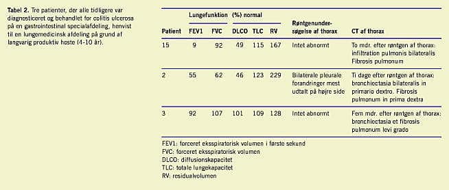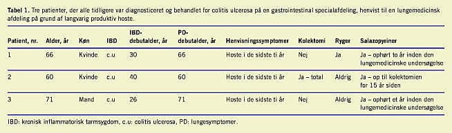 På Lungemedicinsk Afdeling, Amtssygehuset i Gentofte, udføres der årlig 800 fiberbronkoskopier, og over en treårig periode har vi observeret tre patienter, der alle tidligere var diagnostiseret og behandlet for colitis ulcerosa på en gastroinstestinal specialafdeling og henvist på grund af langvarig produktiv hoste (4-10 år) (Tabel 1 ). Alle tre patienter var afebrile. Ingen af dem havde været eksponeret for eksogene kendte toksiske faktorer, herunder asbest, idet to af patienterne havde arbejdet på kontor og den tredje havde arbejdet i forretning (trikotage). Der blev foretaget nasal fleksibel optisk fiberbronkoskopi (Olympus BF 20) i lokal anæstesi. Ved bronkoskopien blev der taget mucosabiopsier med en sketang, transbronkiale biopsier under røntgengennemlysning og bronkialskyl. Skyllevandet blev undersøgt for bakterier, herunder syrefaste stave og tumorceller. Alle fik foretaget konventionel røntgenundersøgelse af thorax, og efter patologisvarene og den usikre diagnose blev der efterfølgende foretaget computertomografi (CT) af thorax, og der blev udført udvidet lungefunktionsundersøgelse (Sensor Medics, Vmax 229).