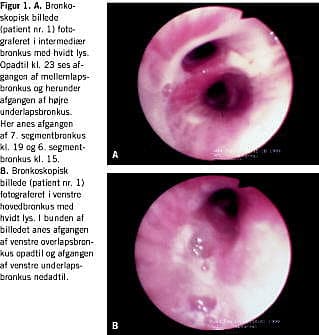 Ved den udvidede lungefunktionsundersøgelse fandt man hos to af patienterne et obstruktiv mønster med forøget lungevolumen, specielt residualvolumen. Ingen af patienterne udviste signifikant reversibilitet over for beta-2-inhalation. Hos to af patienterne fandt man moderat nedsat diffusion (Tabel 2). Ved bronkoskopi fandt man hos alle tre patienter et relativt ensartet makroskopisk billede med moderat til svær bilateral inflammation med fortykkelse, hyperæmi og ødem af bronkieslimhinden, som var dækket af hvidgulligt sekret, som kom fra alle segmentbronkierne bilateralt. Der fandtes ikke makroskopisk tegn på tumor (Figur 1A og Figur 1B ).