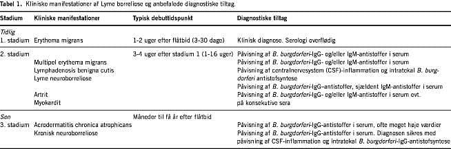Kardinalsymptomerne ved NB er radikulære smerter og/eller pareser. Smerterne beskrives som zosterlignende af fluktuerende karakter med radierende præg. Fra dage til få uger efter smertedebut ses neurologiske udfald hos 60-70% af patienterne. Hyppigst er kranienervepareser, især uni- og bilateral perifer facialisparese. Isoleret parese af ekstremiteterne ses hos ca. 20%. Ved mistanke om NB skal der foretages lumbalpunktur, da diagnosen sikres ved påvisning af lymfocytær pleocytose i spinalvæsken (typisk 100-400 celler/μl) og intratecal Bb -specifik antistofsyntese. Påvisning af specifikke antistoffer i CSF er både mere sensitiv, men især mere specifik end påvisning af antistoffer i blodet. Patienter med NB kan være seronegative op til 6-8 uger efter debut af neurologiske symptomer [3]. Ved klinisk mistanke og fund af pleocytose i CSF bør antibiotisk behandling påbegyndes, også inden et antistofsvar foreligger. Lyme-artrit er karakteriseret ved en mono-oligo artrit, der involverer de store led, især knæet. Det er den dominerende form for systemisk LB i USA. I Europa er den langt sjældnere, og der foreligger ingen større serier, der muliggør konklusion om incidens, forløb eller terapirespons. Det er fortsat uafklaret, om manifestationen opstår på reaktiv eller infektiøs basis. Diagnosen er vanskelig, fordi symptomer og objektive fund ikke adskiller sig fra andre reaktive artritter. Påvisning af forhøjede Bb -IgG-antistoffer i serum understøtter den kliniske mistanke. Der kan sjældent stilles en definitiv diagnose, hvorfor terapi ofte må gives blot på mistanken.