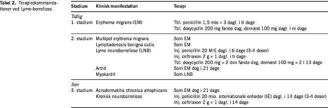 Terapirekommandationer er resumeret i Tabel 2 . Mht. behandlingseffektivitet er regimenerne ligeværdige. Hos patienter med NB er fordelen ved behandling med ceftriaxon den daglige éngangsadministration, der muliggør ambulant behandling. Den kliniske effekt af peroralt givet doxycyclin indtræder noget langsommere end effekten af intravenøst givet antibiotika, hvorfor et intravenøst regimen anbefales hos patienter med udtalte radikulære smerter.