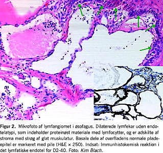 Mikroskopi viste øsofagusslimhinde med normalt, intakt pladeepitel. I det underliggende stroma sås en tumor af dilaterede lymfebaner med fladt endotel uden atypi, nogle steder omgivet af strøg af glat muskulatur (Figur 2). Indholdet var proteinøst med lymfocytter. Tumor nåede helt op til pladeepitelet og til den dybe resektionsrand. Diagnose: lymfangiom uden tegn på malignitet.