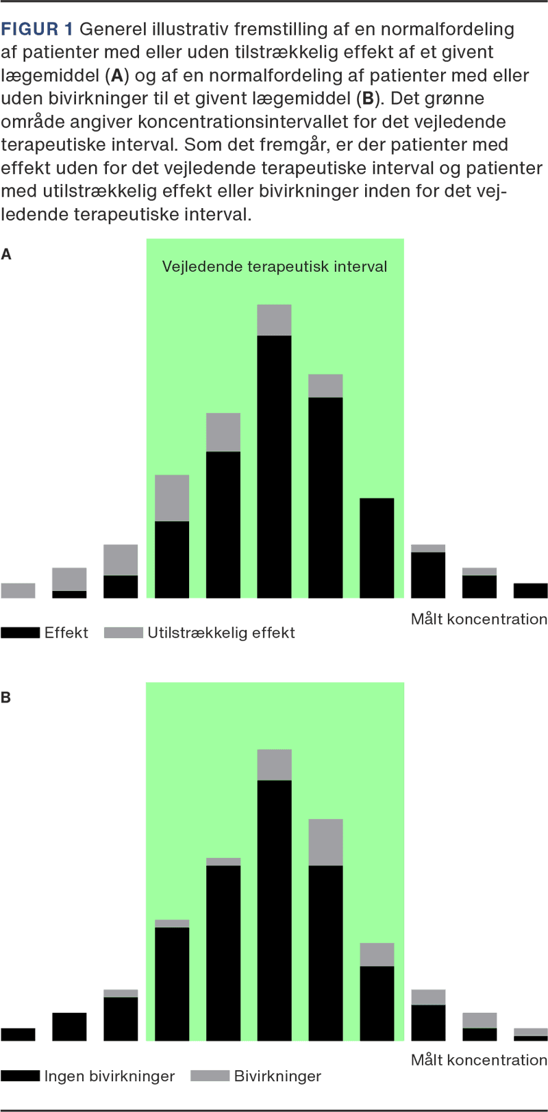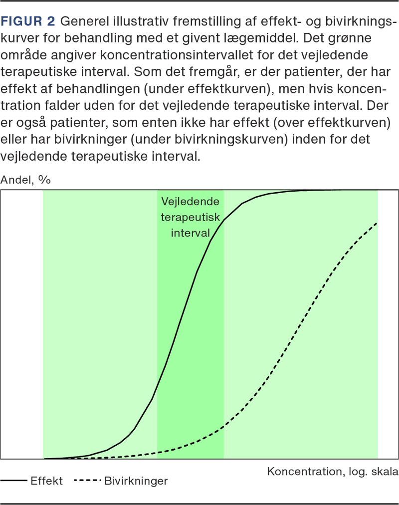 2) En mere ideel metode er at anvende lægemiddelkoncentrationer fra velbehandlede patienter til at definere et vejledende terapeutisk interval. Så ville man i teorien kunne etablere kurver over plasmakoncentrationer, som medfører effekt og bivirkninger, se Figur 2. Hermed tages der åbenlyst højde for den gennemsnitlige behandlingseffekt, men det er væsentlig mere besværligt og dyrt at lave sådanne studier, og disse rummer også etiske udfordringer, f.eks. kan effektkurver fastslås ved at nedtitrere dosis, til effekten bortfalder. Afhængigt af hvilke effektmål man anvender, kan det være klinisk problematisk for patienten. Man kan heller ikke etisk forsvare at optitrere patienter, der allerede er i sufficient behandling, til de får uacceptable bivirkninger. Bivirkningskurven bliver således ofte baseret på tilfældige observationer og kasuistiske rapporter om toksicitet [8].