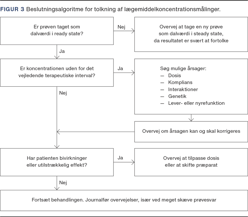 Problemer med fortolkning af TDM-prøver opstår, hvis der ikke er overensstemmelse imellem indikationen for prøven, den ordinerede dosis og den målte lægemiddelkoncentration. I disse situationer må man overveje, om prøven er taget korrekt, om patienten tager sin medicin som foreskrevet, om der kan være ændringer i patientens nyre- eller leverfunktion, samt om der kan være interaktioner eller genetiske faktorer, der påvirker lægemiddelmetabolismen. Figur 3 beskriver en beslutningsalgoritme for fortolkning af lægemiddelkoncentrationer.
