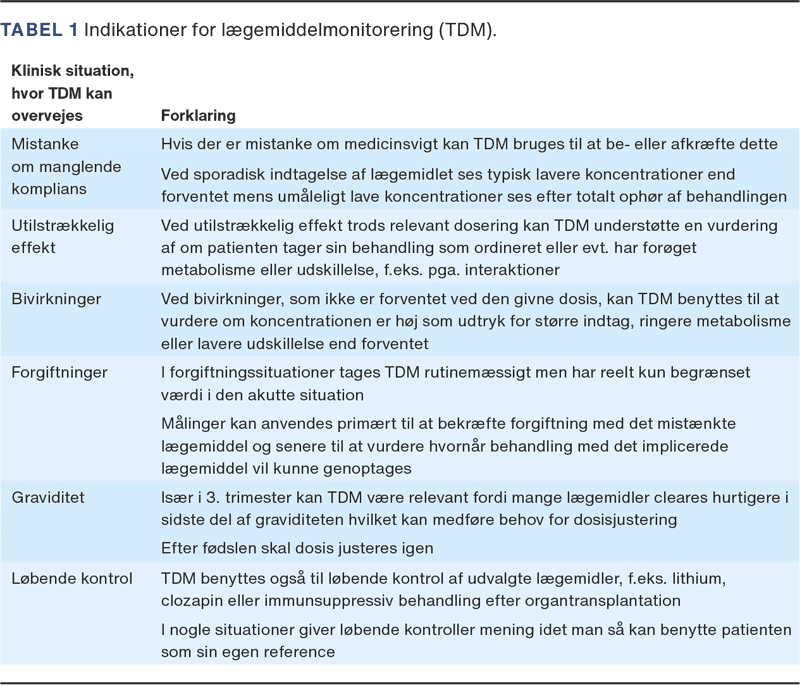 TDM benyttes typisk ved antiepileptiske lægemidler, antipsykotika og tricykliske antidepressiva [2]. Desuden anvendes TDM rutinemæssigt ved lithiumbehandling og længerevarende behandling med aminoglykosider, ligesom det kan være relevant ved andre lægemidler, f.eks. nogle immunsupprimerende lægemidler og visse andre antidepressiva [3]. Ved antiepileptika er undgåelse af behandlingssvigt ofte målet. Det er det også ved TDM af immunsupprimerende lægemidler, hvor man dog også gerne vil undgå nefrotoksicitet ved høje koncentrationer. Ved antipsykotika og antidepressiva er målet især undgåelse af toksicitet. I Tabel 1 ses forslag til kliniske situationer, hvor TDM kan være relevant.