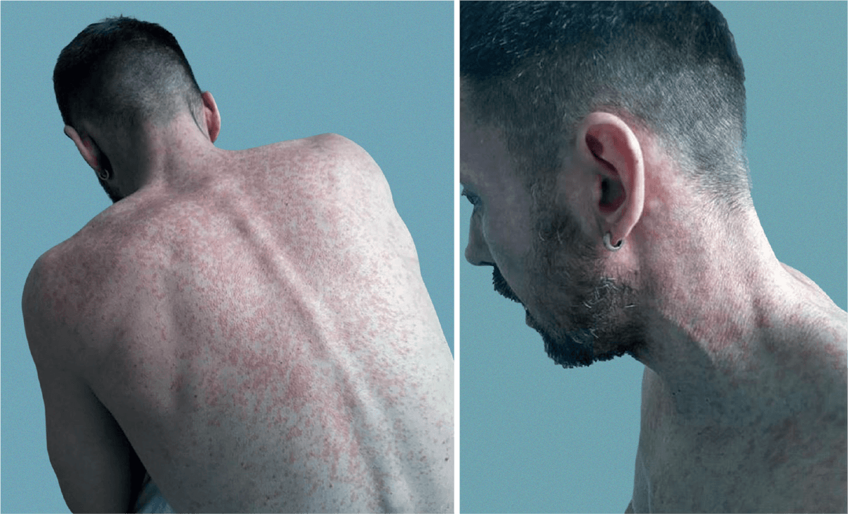 En 37-årig, dansk mand blev set på dermatologisk afdeling med en anamnese med svær hoste, svingende højfebrilia, tynd mave og vægttab gennem ti dage samt et generaliseret udslæt gennem fire dage. Patienten, som i forløbet var set ved egen læge og akutmodtagelse to gange, havde et morbilliformt udslæt på truncus og hals samt erytem i ansigtet, men havde ingen udslæt på hænder og fødder. Der var hvidlige tonsilbelægninger, men ingen sikre Kopliks pletter. Der var ingen historik med seksuel risikoadfærd, og der forelå negativ hiv- og syfilistest seks måneder forinden. Patienten var ikke MFR-vaccineret. Der var ingen historik med udlandsrejser, men erhvervsmæssig kontakt til personer fra lande med kendt cirkulation af mæslingevirus. Mæslingevirus blev påvist ved PCR fra svælgpodning, og blodprøve viste positiv IgM-morbillivirusantistof/negativ IgG-morbillivirusantistof. Embedslægen blev kontaktet, og Styrelsen for Patientsikkerhed blev involveret i smitteopsporingen. Patienten kom sig uden komplikationer og lod sig siden MFR-vaccinere for at opnå beskyttelse mod parotitis epidemica og rubella.