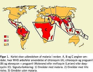 Malaria er en alvorlig infektion, som ubehandlet ofte vil være dødelig hos nonimmune, der smittes med Plasmodium falciparum . Rejser til områder, hvor der er risiko for smitte med malaria medfører derfor, at den rejsende skal rådgives omkring risiko for smitte og muligheder for forebyggelse. Myggemidler, der smøres på huden, giver en vis beskyttelse mod myggestik [1], men er utilstrækkeligt ved høj smitterisiko og vil ikke blive omtalt yderligere her. Myggenet imprægneret med syntetiske pyretroider giver op mod 50%'s beskyttelse anvendt omkring sengen om natten, men vil ikke blive diskuteret yderligere [2]. Der findes ingen vaccine mod malaria.