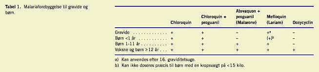 Valg af midler til malariaforebyggelse hos børn og gravide fremgår af Tabel 1 . Chloroquin og proguanil har været anvendt i over 50 år, uden at man har registreret teratogene bivirkninger, og begge midler anses for at kunne anvendes under graviditet og til børn i alle aldre inklusive spædbørn. Proguanil er en folinsyreantagonist, og ud fra teoretiske overvejelser bør man give tilskud af folinsyre til gravide, der anvender proguanil som malariaforebyggelse.