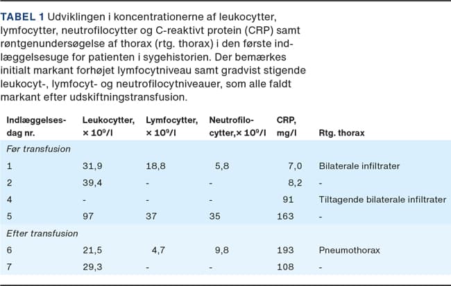 I forløbet udviklede hun svær leukocytose på 97 × 109 leukocytter/l (normalområde: 6,9-19,9 × 109/l) med lymfocytose på 37 × 109 lymfocytter/l (normalområde: 0,8-9,1 × 109/l) (Tabel 1). Ved ekkokardiografi fandt man pulmonal hypertension. Hun udviklede desuden oliguri og vedvarende takykardi. Det blev besluttet at foretage udskiftningstransfusion, som udførtes iht. retningslinjerne for udskiftningstransfusion ved svær hyperbilirubinæmi.