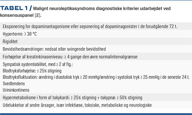 Malignt neuroleptikasyndrom (MNS) er en sjælden og alvorlig komplikation, som kan opstå i forbindelse med behandling med antipsykotisk medicin, der farmakodynamisk helt eller delvist blokerer dopaminerge receptorer. MNS er hyppigst udløst af førstegenerationsantipsykotika, men de nyere andengenerationsantipsykotika kan også udløse syndromet [1]. Tilstanden kendetegnes især ved udtalt muskelstivhed, hypertermi og bevidsthedspåvirkning. Der er forsøgt udarbejdet diagnostiske kriterier, som dog ikke er klinisk validerede [2] (Tabel 1). Nedenstående er en komprimeret forløbsbeskrivelse af MNS udløst af andengenerationsantipsykotika.
