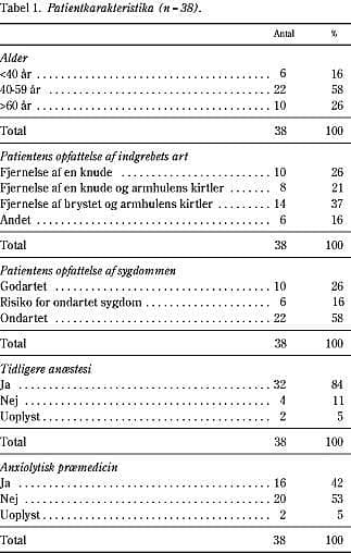 Otteogfyrre patienter opfyldte inklusionskriterierne. Ni patienter ønskede ikke at deltage i undersøgelsen. Én patient deltog ikke i undersøgelsen pga. misforståelser hos afdelingens personale. I alt deltog således 38 patienter, både ambulante og indlagte, som alle besvarede angstskalaerne dagen før operationen.