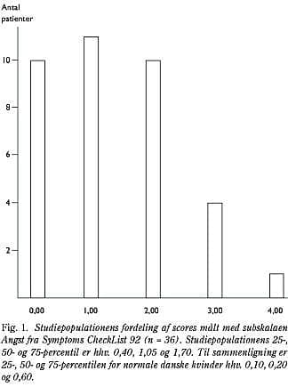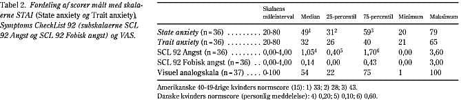 Resultater: Man fandt signifikant korrelation mellem STAI State anxiety, Symptoms CheckList 92 Angst og visuel analogskala. Studiepopulationens angstscore målt på STAI State anxiety og Symptoms CheckList 92 Angst var markant højere end raske kvinders i baggrundspopulationen.