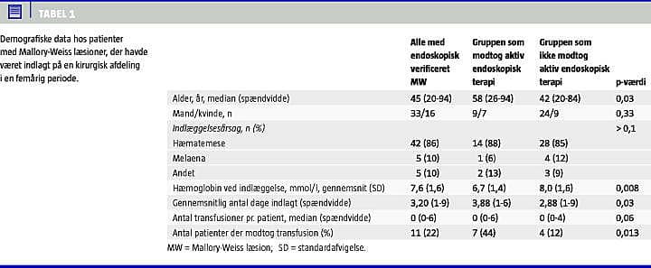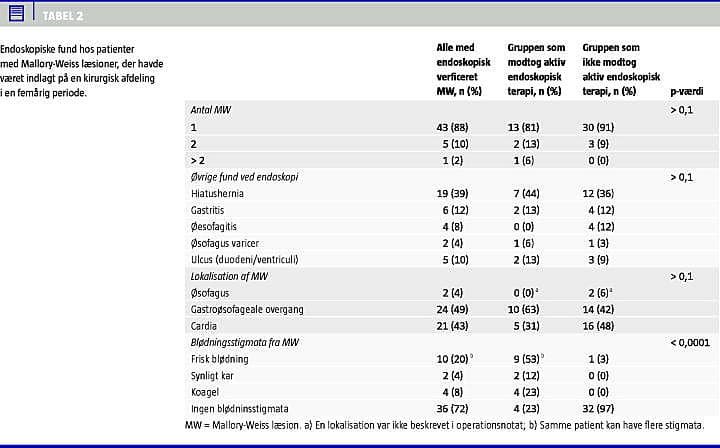 Treogtredive patienter (67%) blev behandlet konservativt med monitorering efter endoskopi. Hos alle 49 patienter blev der opnået primær hæmostase, og alle kunne udskrives i live. Hver tredje patient havde hiatushernie, og halvdelen af MW i den gastroøsofageale (GE)-overgang var associeret med hiatushernie mod en tredjedel af cardialæsionerne (Tabel 2).