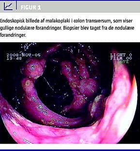 En 78-årig kvinde blev henvist til en privat endoskopiklinik på grund af 4-6 ugers diarré (op til ti gange om dagen) og almen utilpashed. Forud for dette var patienten via sin praktiserende læge blevet behandlet med prednisolon 50 mg i fem dage på grund af ømme muskler og nakkestivhed. Indledende biokemi før koloskopi afslørede anæmi (hæmoglobin 5,2 (ref. 7,1-9,3) mmol/l, middelcellevolumen 96 (ref. 82-98) fl; ferritin 217 (ref. 12-300) mg/l; transferrin 19 (ref. 24-41) mmol/l og forhøjet C-reaktivt protein 193 (ref. < 10) mg/l) med et normalt leukocyttal. Den initiale koloskopi viste gullige, nodulære forandringer i hele tyktarmen, mest udtalt i transversum (Figur 1 ). Røntgen af thorax, ultralyd af abdomen, immunoglobuliner, thyroideastimulerende hormon og levertal var normale, og en hiv-test samt undersøgelse for M-komponent var negativ. Biopsier fra colon afslørede i slimhindens lamina propria ophobning af histiocytter, der indeholdt MGL og var positive for von Kossa farvning samt reagerede immunohistokemisk med antistoffer mod CD-68 - hvilket var foreneligt med diagnosen MP. Der blev på baggrund af dette opstartet empirisk behandling med ciprofloxacin (500 mg × 2) oralt i ti dage, og patienten blev udskrevet til videre opfølgning i daghospitalet. Efter yderligere to uger afslørede en fornyet koloskopi fortsat omfattende nodulære forandringer i colon, der nu var af mere mørkfarvet karakter. Mikrobiologisk dyrkning af biopsier fra colon udviste moderat vækst af Escherichia coli (EC) og Enterococcus faecium. Førstnævnte var resistent for ciprofloxacin, og begge var følsomme for kombinationsbehandling med trimethoprim (TM) og sulfamethizol (SM). På det tidspunkt var der fortsat symptomer i form af vandig diare, kvalme og træthed, og kombinationsbehandling med SM og TM blev derfor startet. Herefter oplevede patienten en langsom men vedvarende positiv effekt på afføringsfrekvens og almen tilstand. Den subjektive bedring fortsatte i 2,5 måneder, hvorefter en kontrolsigmoideoskopi viste næsten fuld makroskopisk helbredelse og kun helt sporadiske resterende forandringer. Patienten udviklede efter tre måneders behandling et rødt, skællende og kløende eksem, der blev tilskrevet SM-behandlingen. På daværende tidspunkt havde patienten en normal daglig afføring og normaliserede hæmatologiske og inflammatoriske parametre. Den antibiotiske behandling blev derefter seponeret uden tilbagefald af sygdommen.