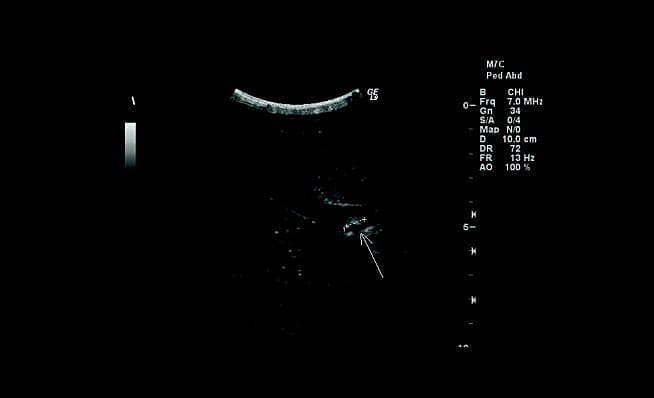 En tiårig, tidligere rask dreng blev henvist med vedvarende smerter under højre kurvatur igennem to måneder. Der var ingen feber, opkastninger eller kvalme, der var normal afføring, og blodprøver viste normale forhold. En ultralydskanning foretaget på en privat klinik havde givet mistanke om galdesten.