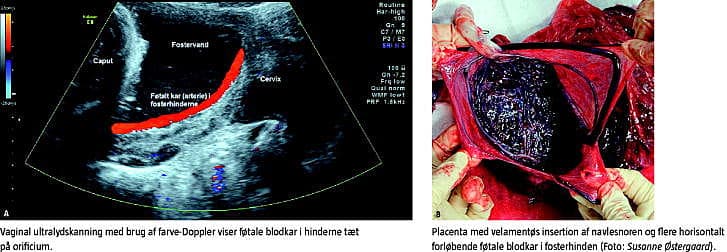 En 36-årig nullipara, gravid 33 uger + 5 dage kom til kontrol af placentas beliggenhed, idet man ved skanning i 20. uge havde fundet, at placenta dækkede orificium internum. Ved en ultralydskanning sås et normalvægtigt barn i hovedstilling. Placenta lå på bagvæggen, 22 mm fra orificium. Navlesnoren var velamentøst insereret, og der fandtes flere kar i hinderne tæt på orificium (A).