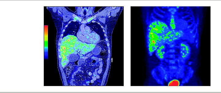 Positronemissionstomografi (PET)/computertomografi (CT) viser multiple opladende processer i leveren. Det aksiale skelet oplader pga. øget metabolisme i regenererende knoglemarv. Nyrer og urinveje oplader pga. udskillelse af traceren (18 F-deoxy-glukose).
