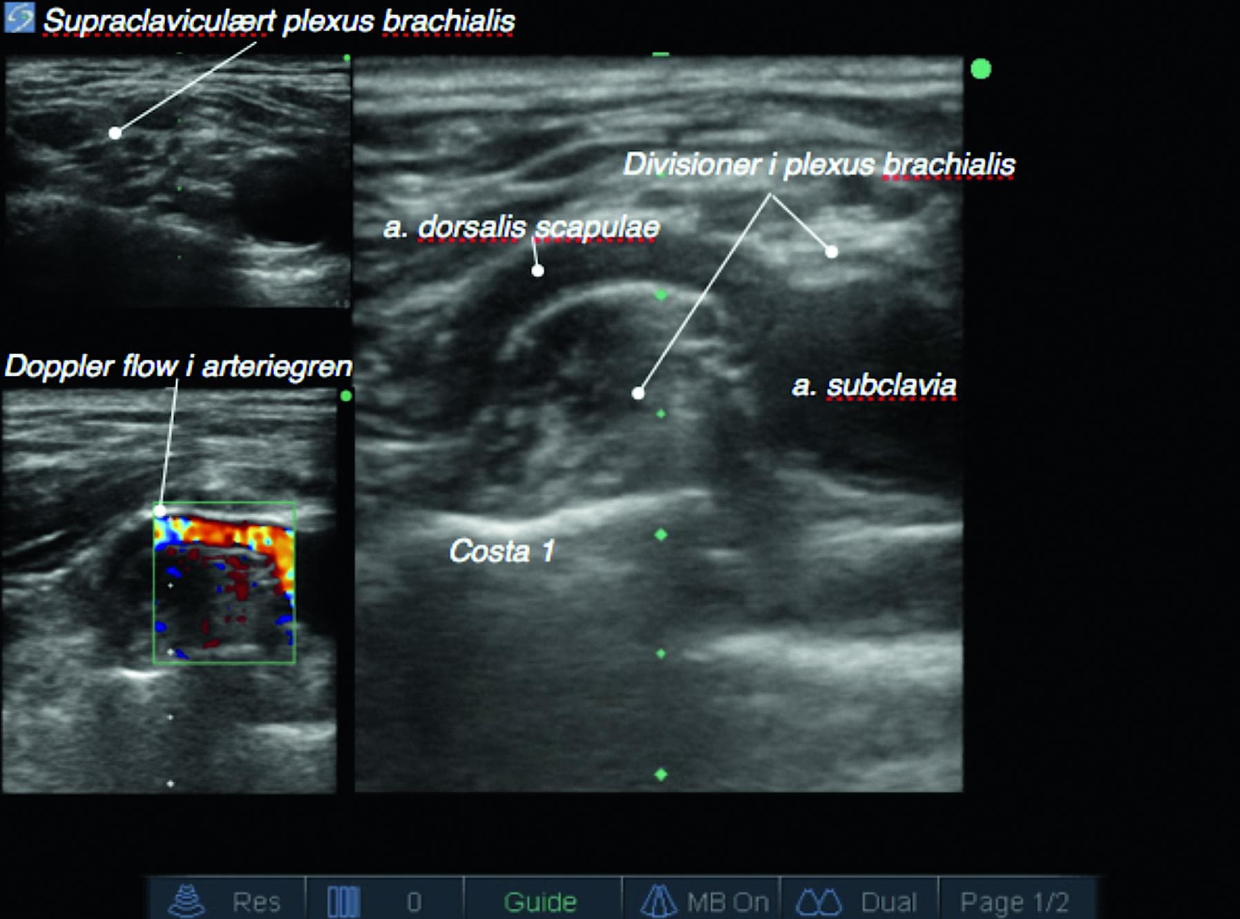 Hos mennesket er der ofte en anatomisk standard med en række varianter. I plexus brachialis er der beskrevet talrige varianter. På billedet ses plexus brachialis med en stor arteriel sidegren fra arterie subclavia, arteria dorsalis scapulae. Billedet understreger vigtigheden af at visualisere injektionsområdet for at reducere risikoen for intravasal injektion. Variationen med en stor sidegren fra arterie subclavia, som går igennem pleuxus brachialis, er i litteraturen beskrevet som værende normal [1].