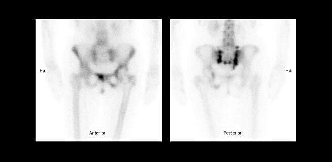 Tc-HDP viser en bilateral, såkaldt insufficiensfraktur i bækkenet foruden løshed af venstresidig hofteprotese.